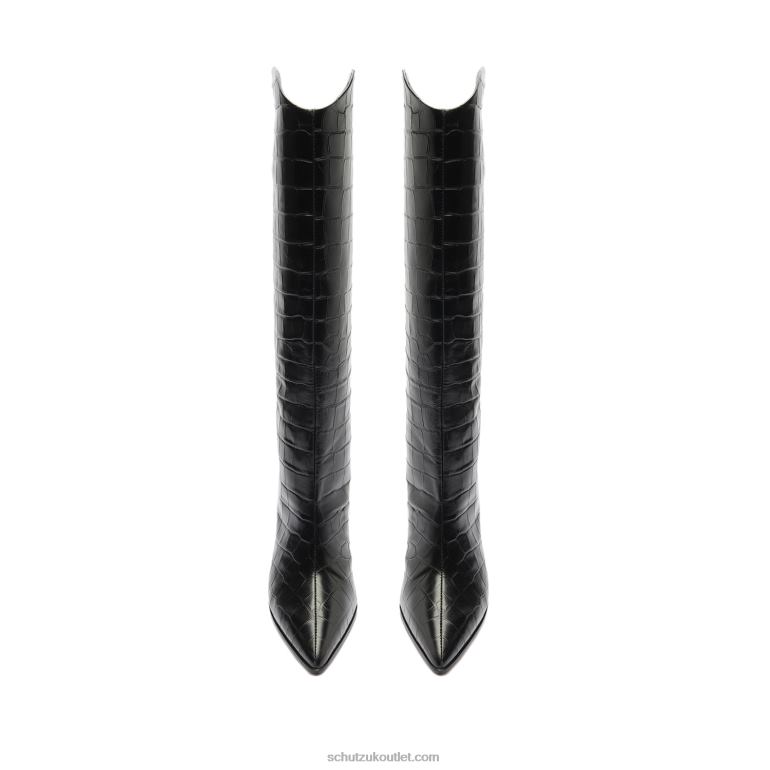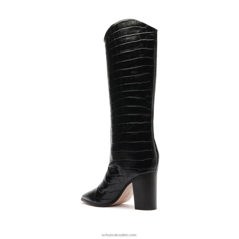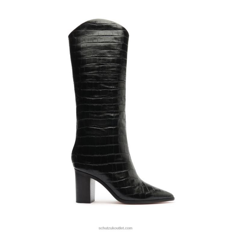 The Maryana Block Boot is a knee-high silhouette crafted from Wide Crocodile-Embossed Leather with a chunky stacked heel. This versatile slip-on style features a flattering almond-shaped toe and complements daytime and evening outfits with a chic sensibility. The Schutz woman will wear hers with a flowy midi dress or a pleated skirt.