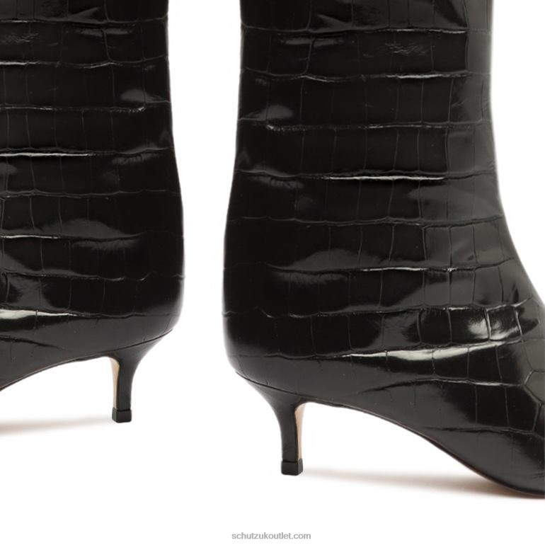 Maryana's heel is reshaped and chicer than ever in crocodile-embossed leather. The sleek, knee-high silhouette showcases a softly pointed toe and walkable kitten heel for a subtle lift.