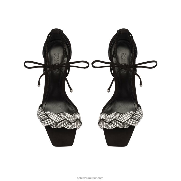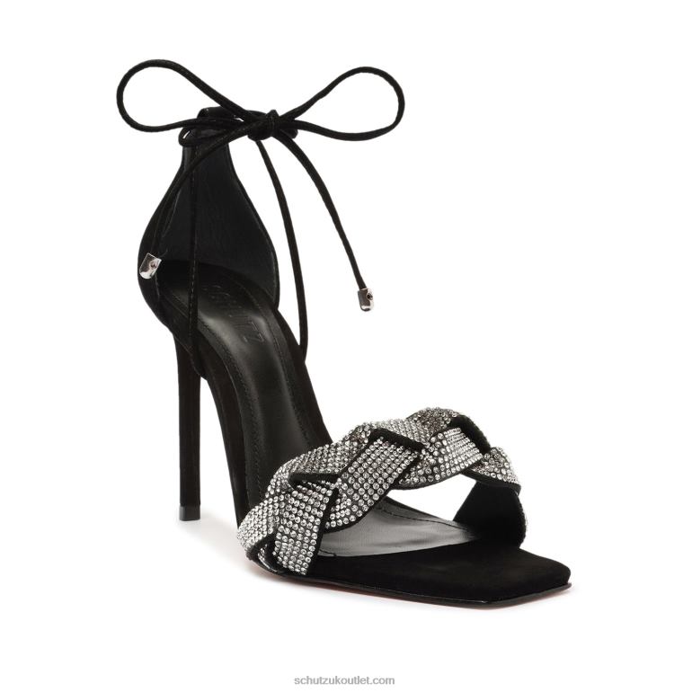 A braided and embellished upper strap and ankle-tie fastening define this soaring stiletto-heeled sandal.