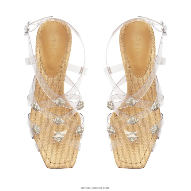 Showcasing vinyl criss-cross straps topped with embellished studs and a thin stiletto, this sandal gives your wardrobe an edgy and classy finish.