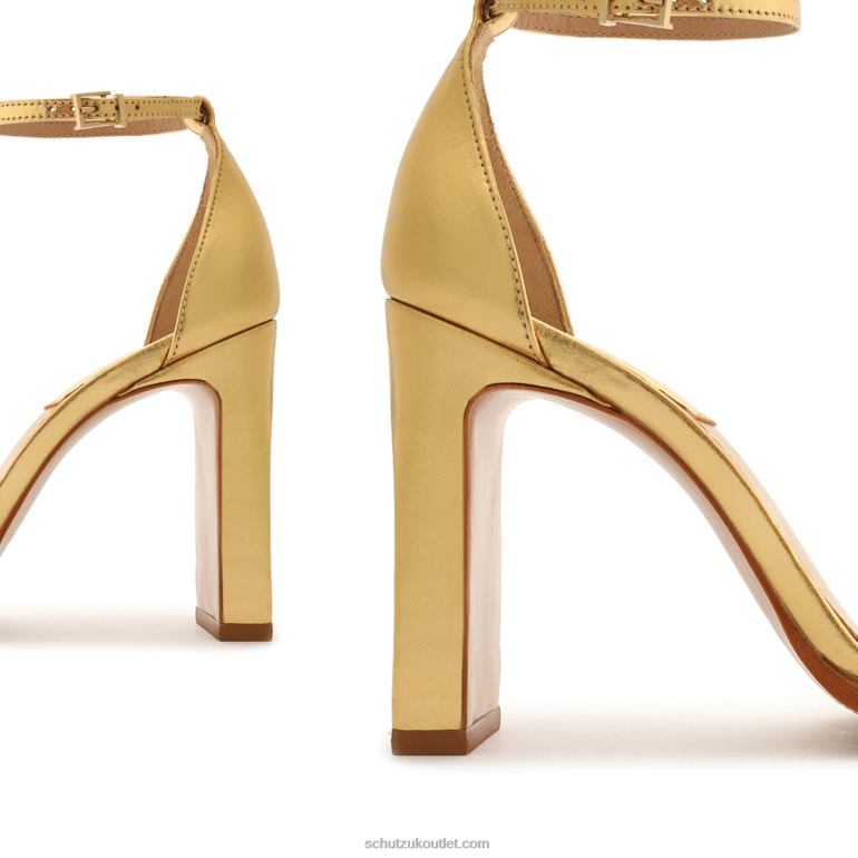 Materials: Metallic Leather | Cow leather lining | Cow leather outsoleUpper format: Unique strapHeel Type: High HeelHeel Style: BlockClosure Type: Buckled strapToe Style: Round toeCounter Type: ClosedHeel Height: 4.2in | 107mmRubber patch at the heel.