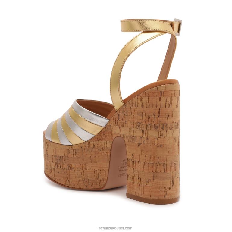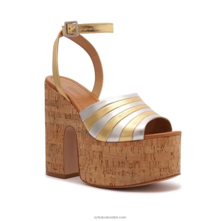 Give your spring pastels some glam with the Imani Metallic Leather Sandal, featuring thick metallic straps at the front, an adjustable ankle strap, and a high cork platform.