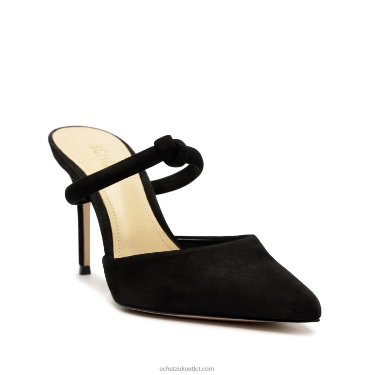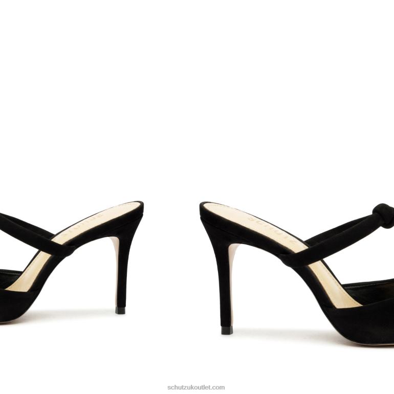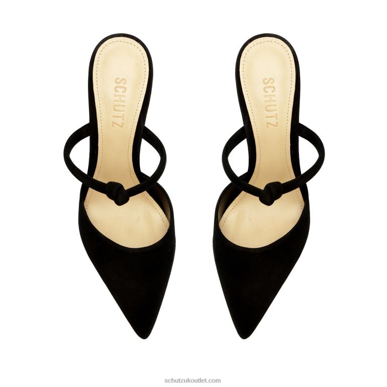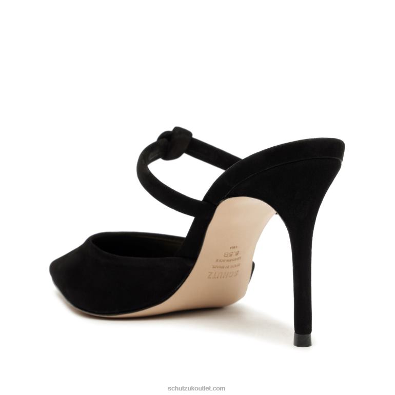 Pearl is a polished open-back pump in suede showcasing a pointed toe, knotted strap, and stiletto heel.